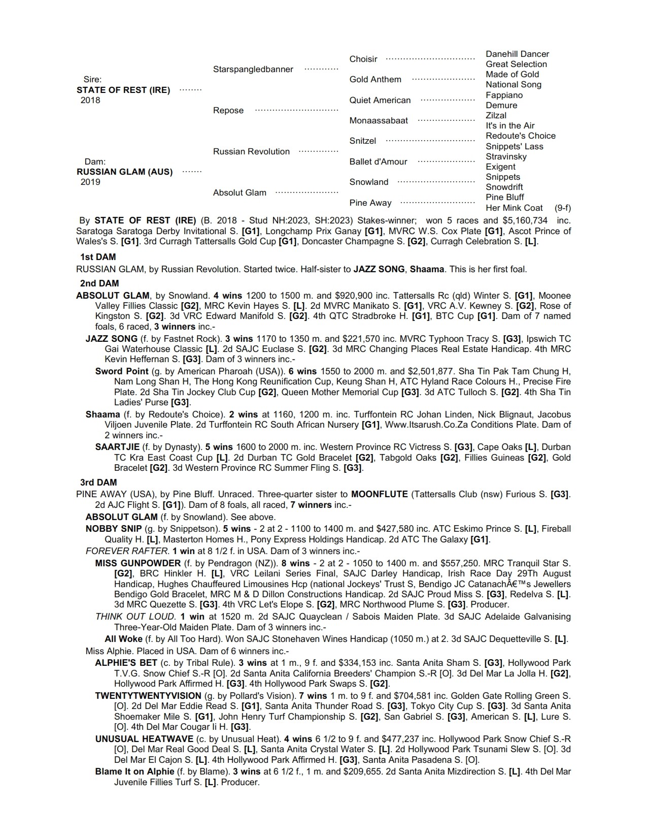 State Of Rest X Russian Glam 1 Year Old Bay Colt ProfilePedigreeMediaEnquire Sire: State of Rest Colour: Bay Dam: Russian Glam Sex: Colt Age: 1 Foaled: Oct 04, 2024 Country: Price:POE Silks: Proven Thoroughbreds First Name (required) Last Name (required) Your Email (required) Phone Message Hello, I'd like to know more regarding the horse State Of Rest X Russian Glam you have listed as available. Send Δ