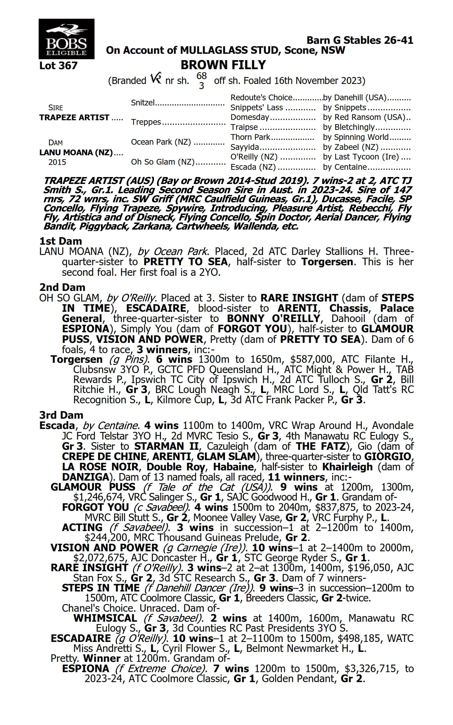 Trapeze Artist X Lanu Moana 2 Year Old Brown Filly ProfilePedigreeMediaEnquire Sire: Trapeze Artist Colour: Brown Dam: Lanu Moana Sex: Filly Age: 2 Foaled: Nov 16, 2023 Country: Price:POE Silks: Proven Thoroughbreds Incentives: First Name (required) Last Name (required) Your Email (required) Phone Message Hello, I'd like to know more regarding the horse Trapeze Artist X Lanu Moana you have listed as available. Send Δ